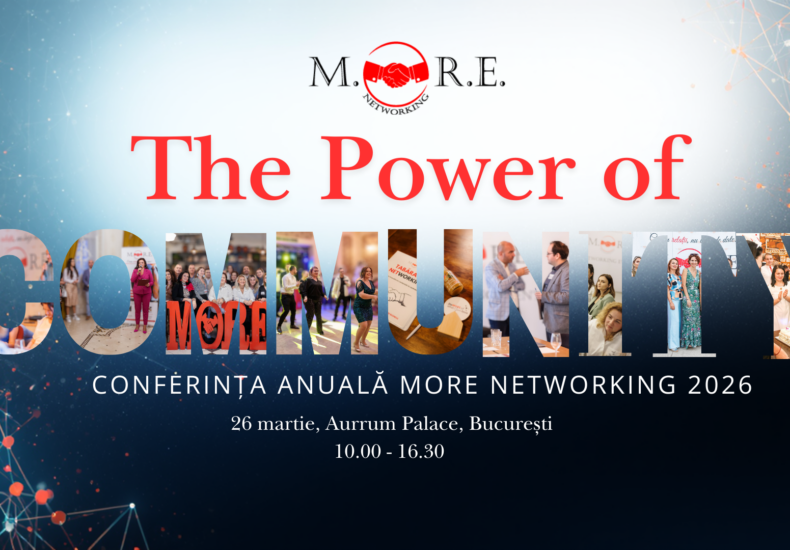 MORE Networking celebrează 10 ani printr-o conferință despre puterea conexiunilor și comunităților O zi intensă de discuții, paneluri și networking dedicată liderilor de comunități, antreprenorilor și managerilor. Pe 26 martie 2026, la Aurrum Palace, are loc Conferința Anuală MORE Networking 2026 – o ediție specială care marchează 10 ani de la lansarea uneia dintre cele